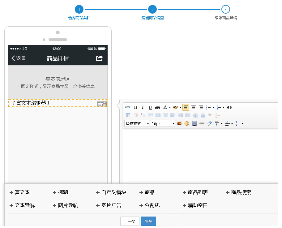 完成好商品的基本信息后,再填写商品详情页内容,点击保存。(保存后默认都在仓库中)