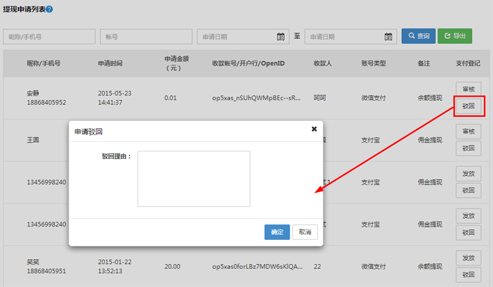 提现申请管理:输入手机号、申请日期查询,将申请提现的信息支付登记。驳回功能,要申明驳回理由才可以成功驳回。